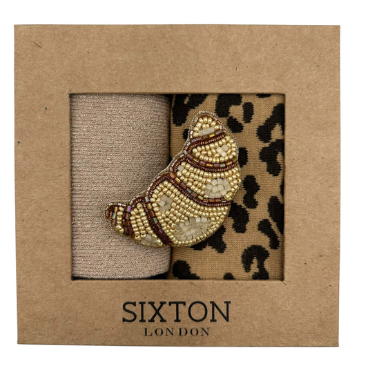 Champagne Vegas & Leopard sock box duo with embroidered brooch