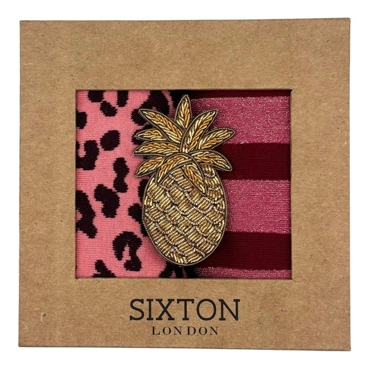 Red Berlin & Pink Leopard sock box duo with embroidered brooch