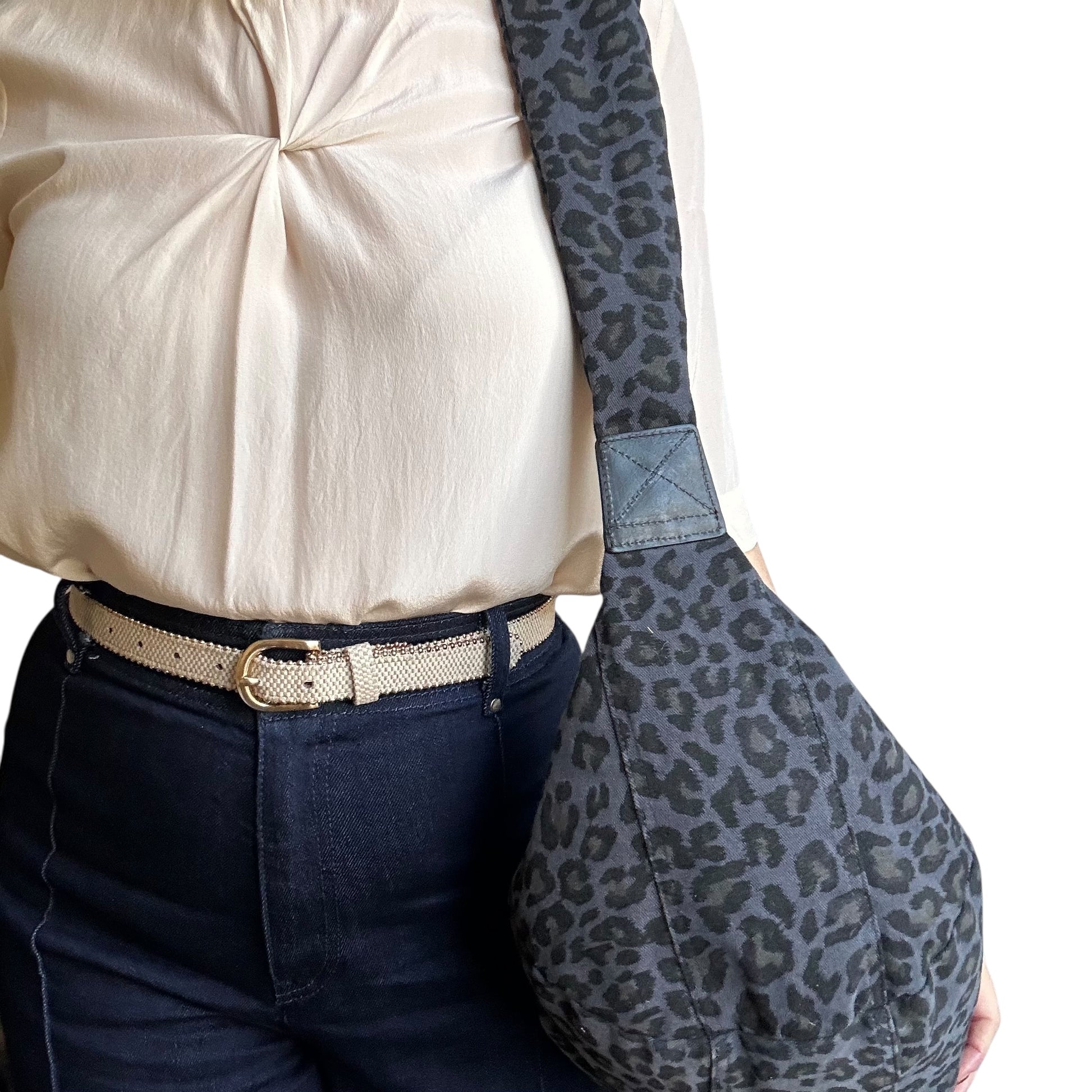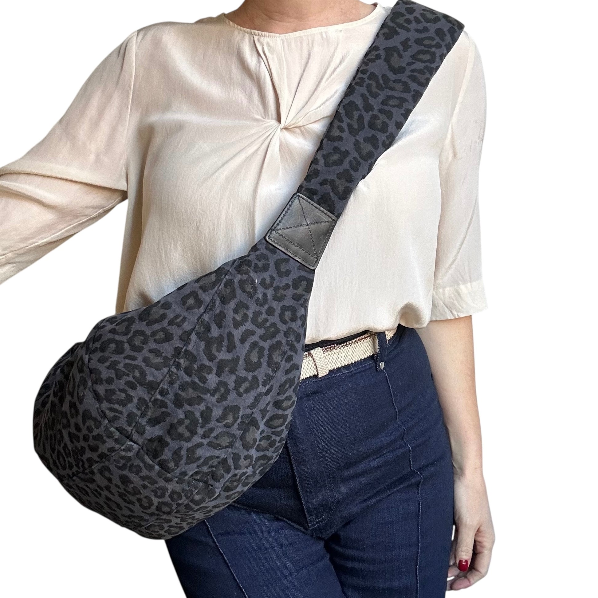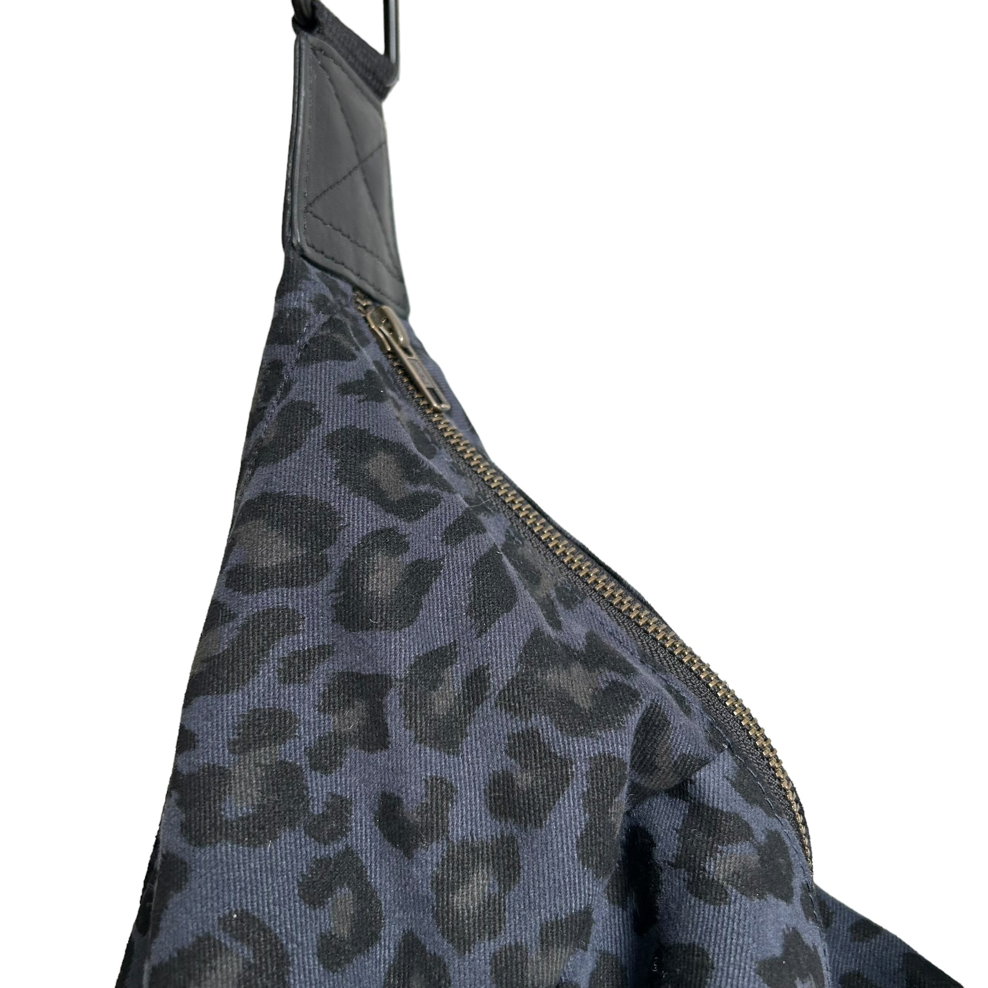 The Brixton bag - a stylish sling bag / cross body style bag in a dark blue leopard print, made from recycled cotton. Also available in small.