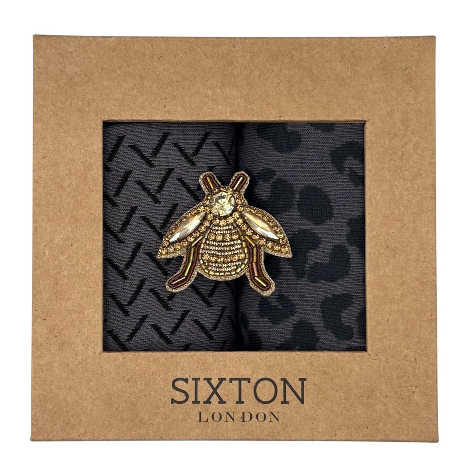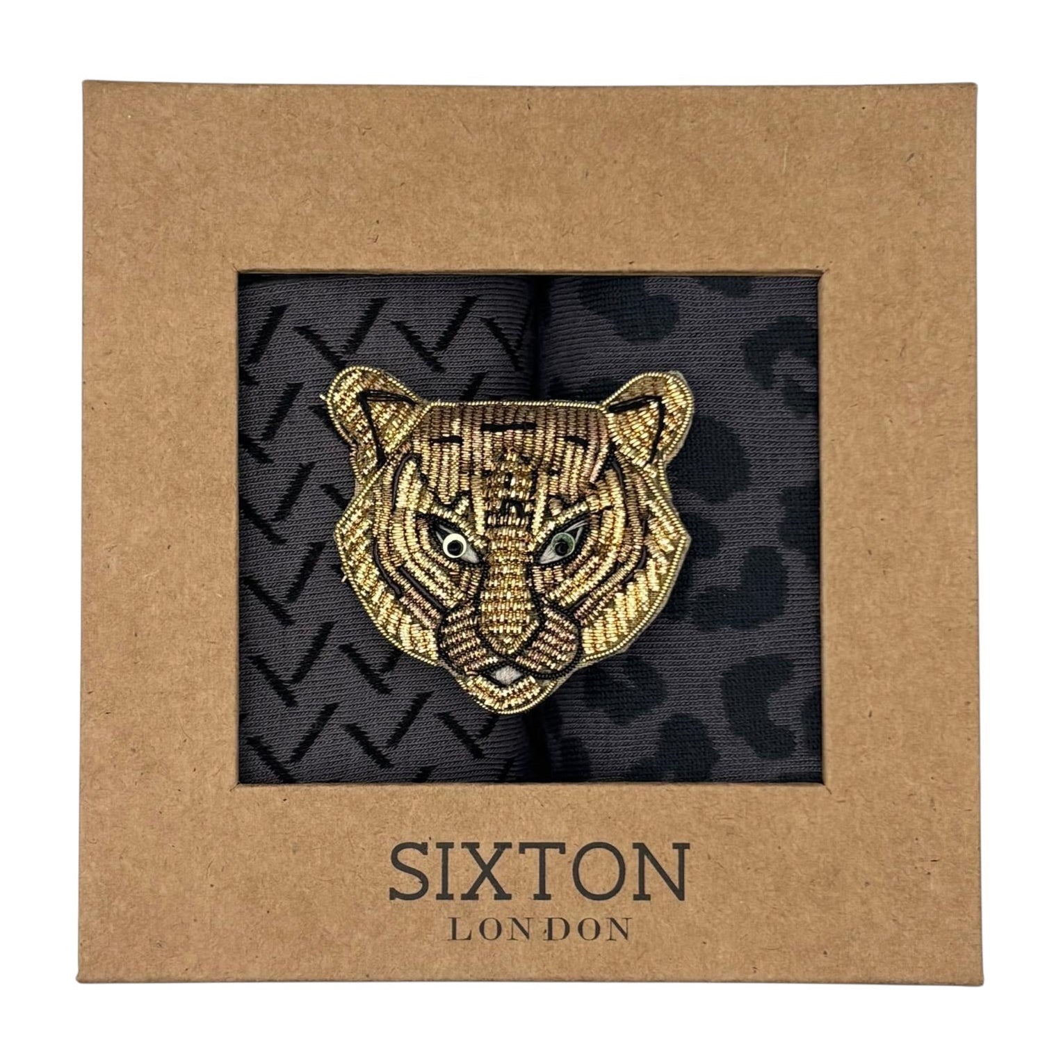 Charcoal Kyoto & Leopard sock box duo with embroidered brooch