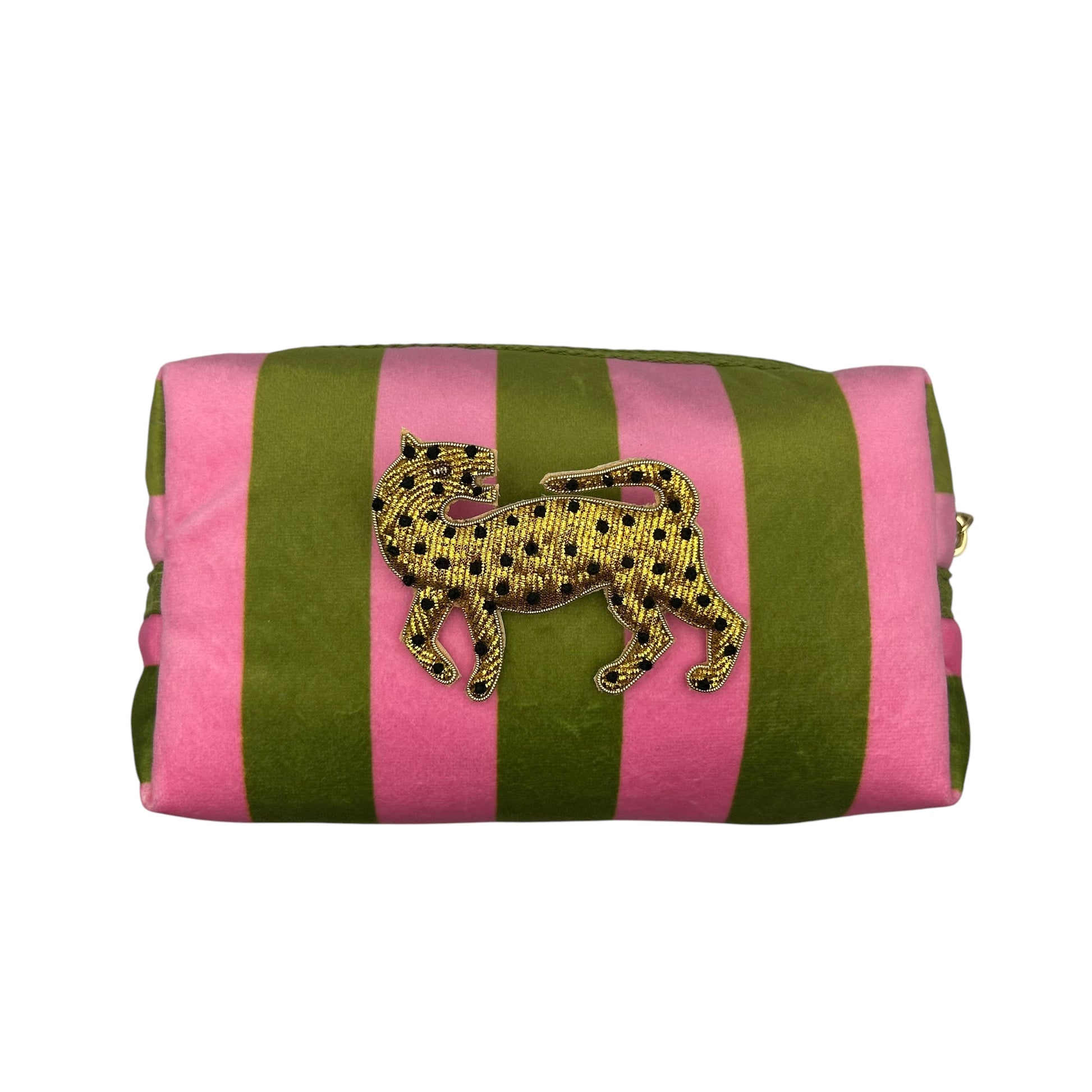 A gorgeous chartreuse and pink stripe velvet makeup bag, with a detachable Leopard brooch.