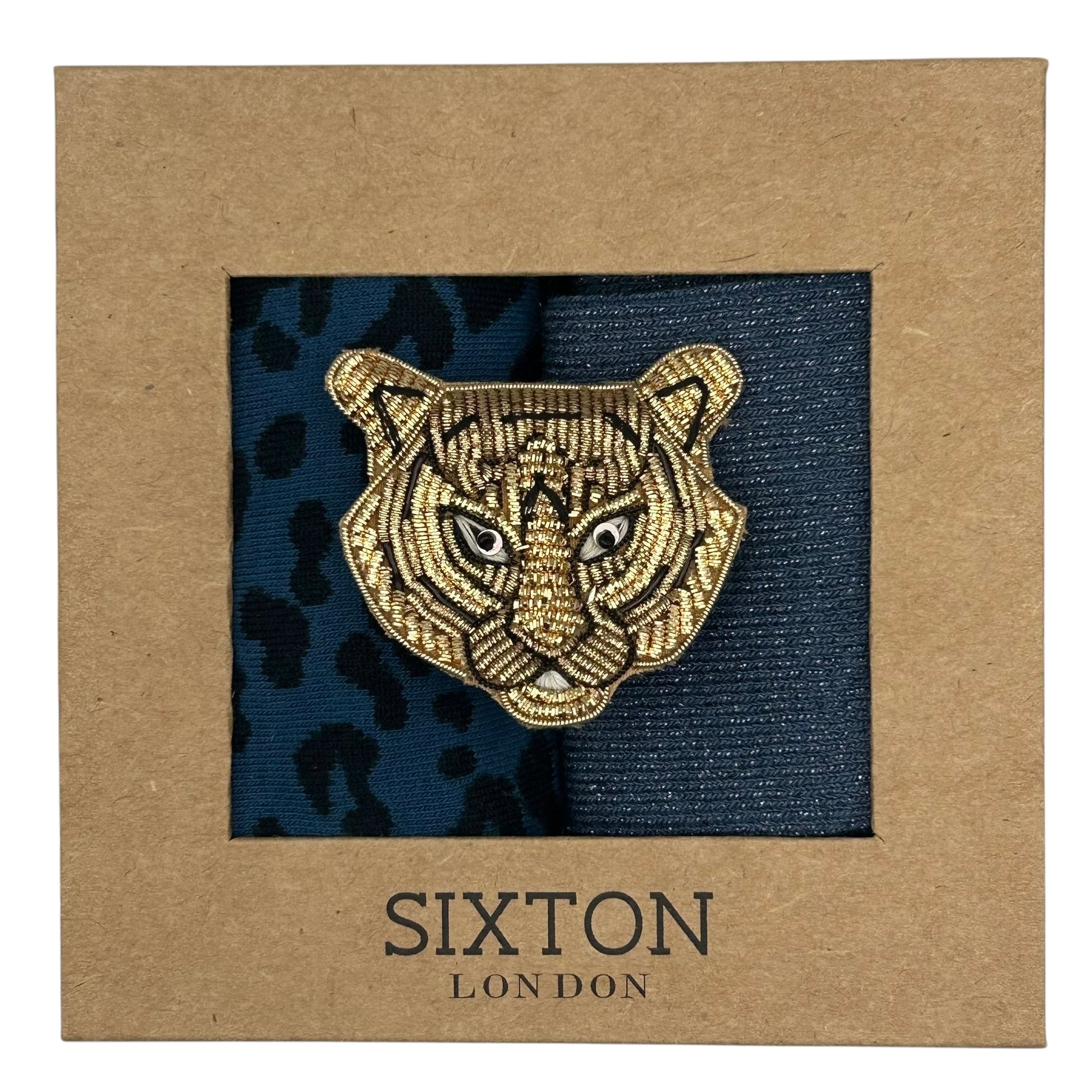 Denim Leopard & Blue Vegas sock box duo with embroidered brooch