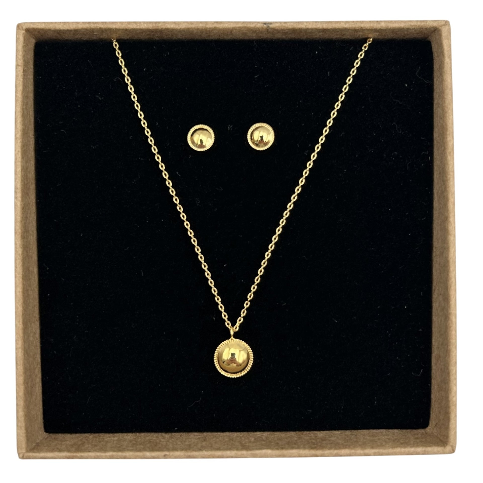 This set includes a stylish, domed pendant necklace and matching earrings.