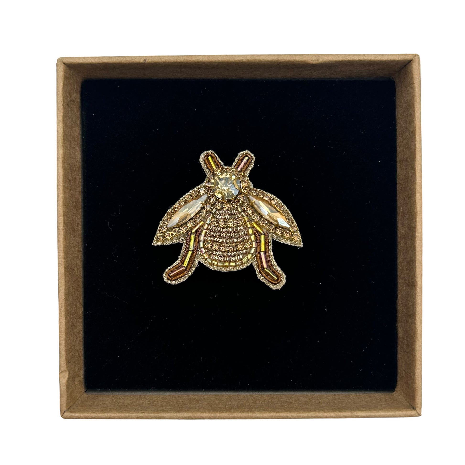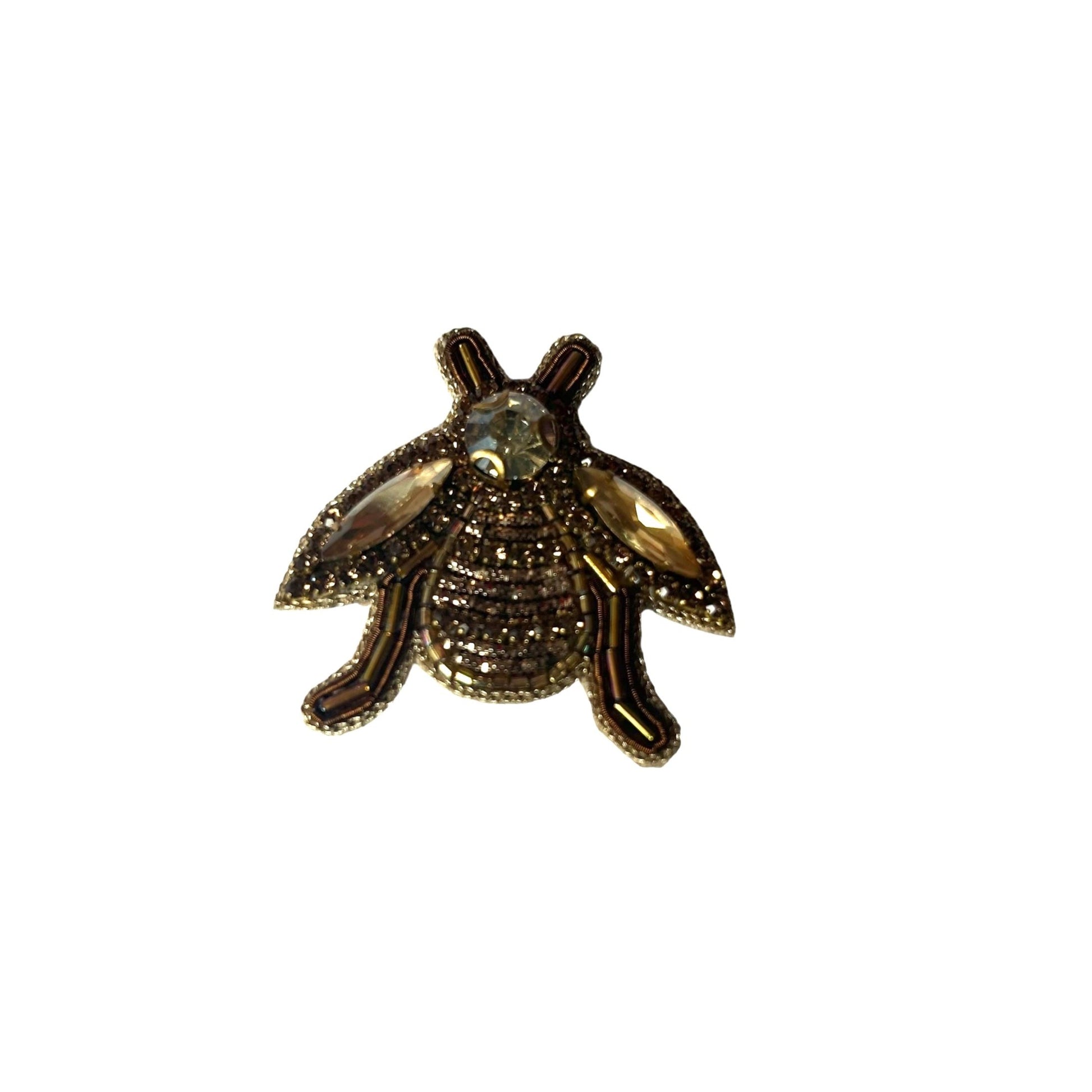 A stunning gold, beaded and jewelled insect brooch. Hand embroidered with gold-glitter thread.