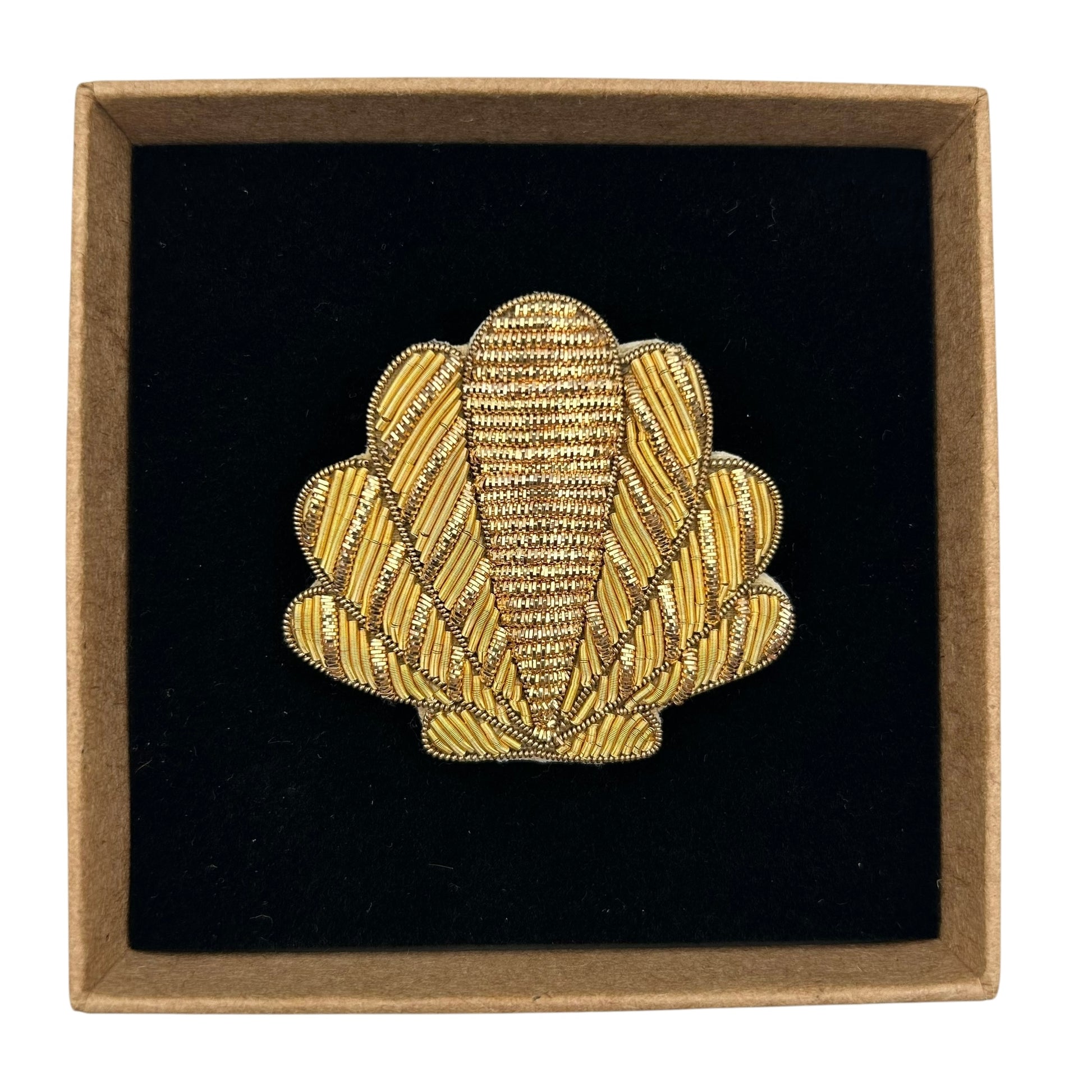 A hand embroidered, beautiful shell shaped brooch. The brooch comes in a recycled gift box.
