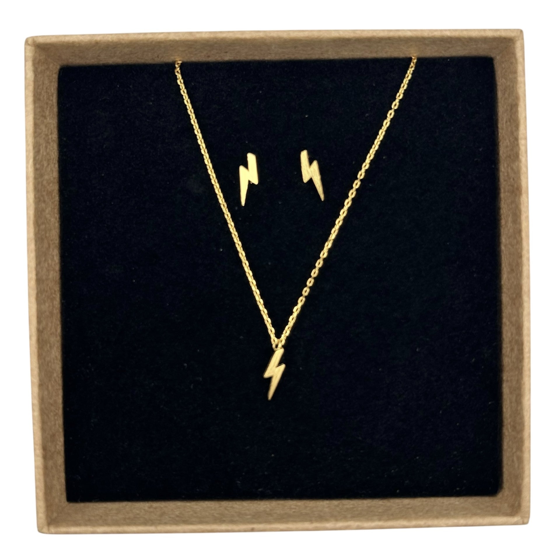 This set includes a golden lightning bolt pendant, on a brushed gold plated effect necklace, with matching earrings.