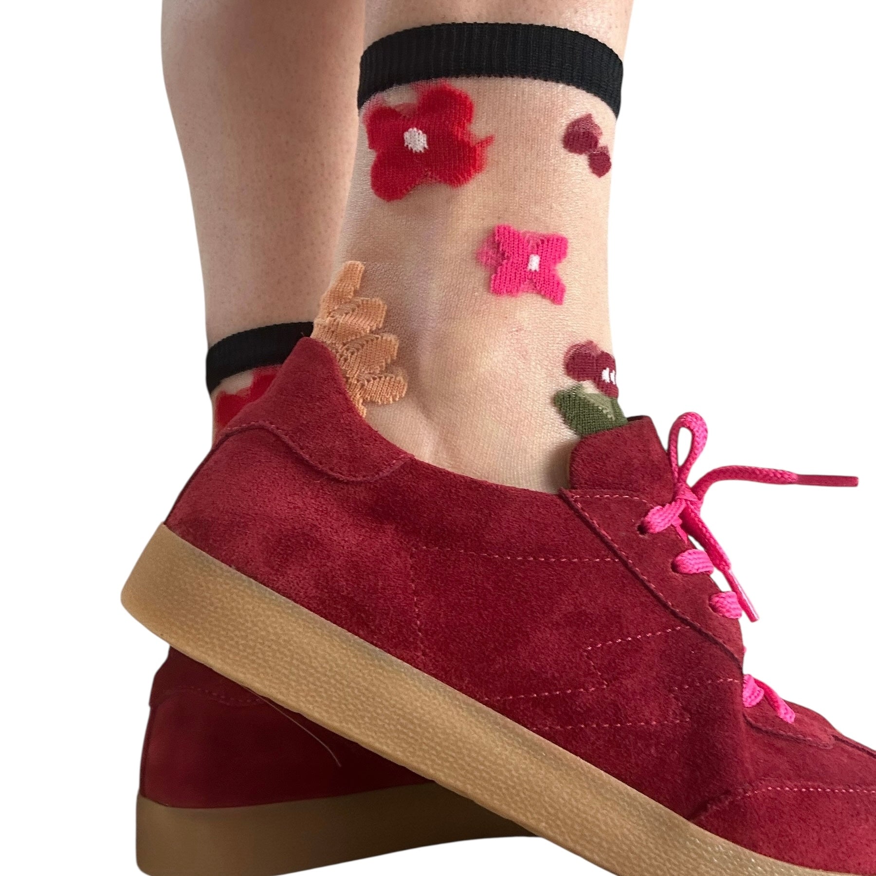 A pair of very fine, transparent socks with brightly colour, textured patterns.