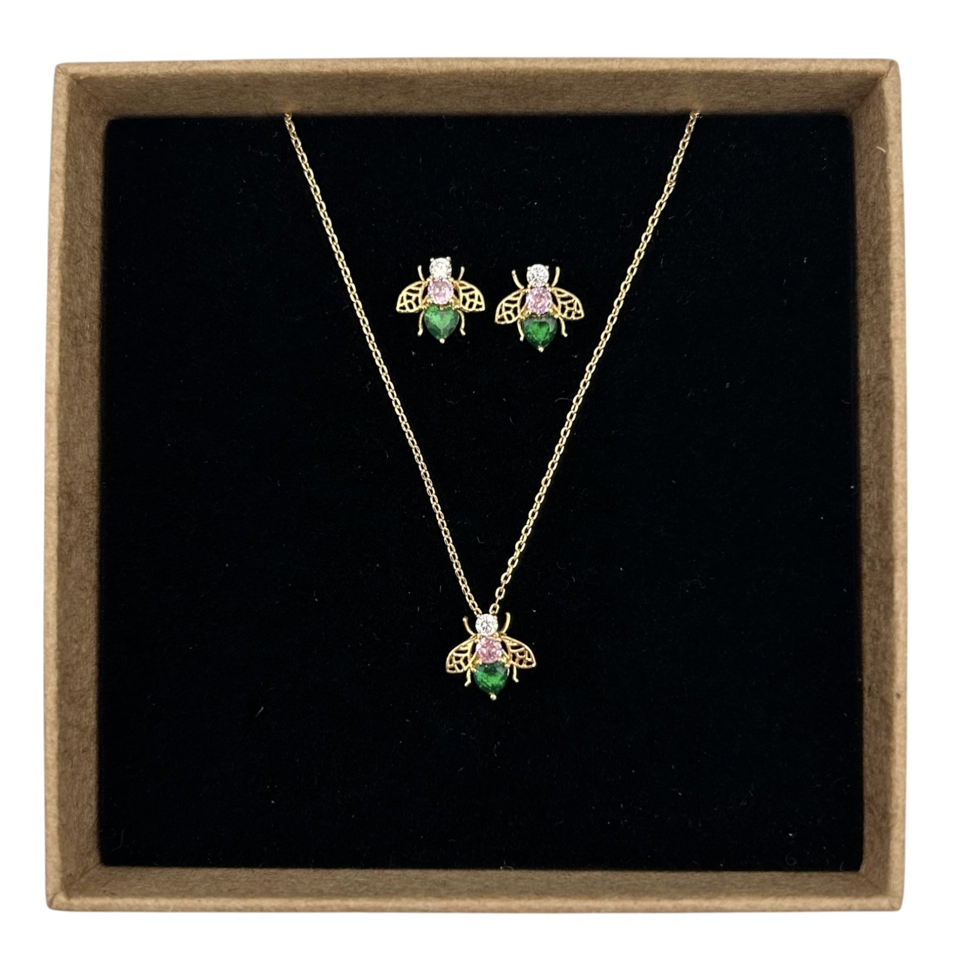 This set includes our delicate bee necklace, featuring 3 coloured jewels, with matching earrings.
