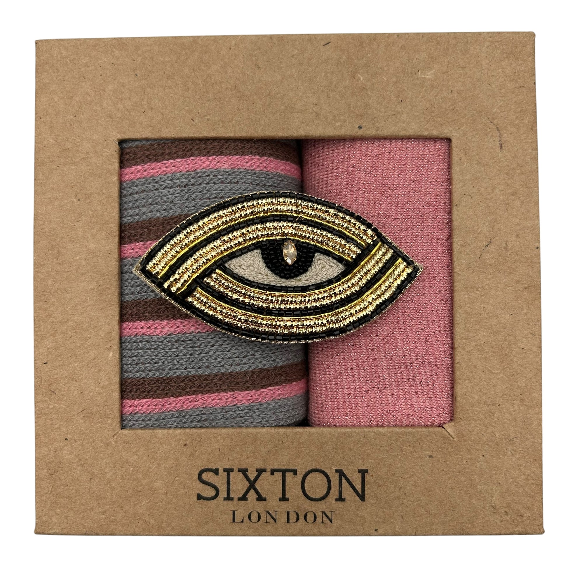 Seoul & Tokyo Pink sock box duo with embroidered brooch