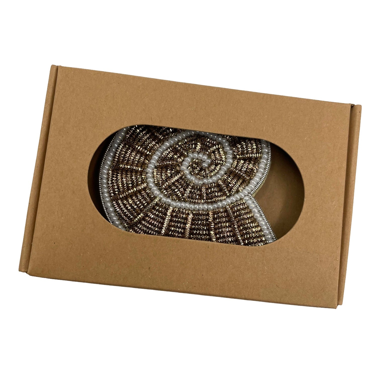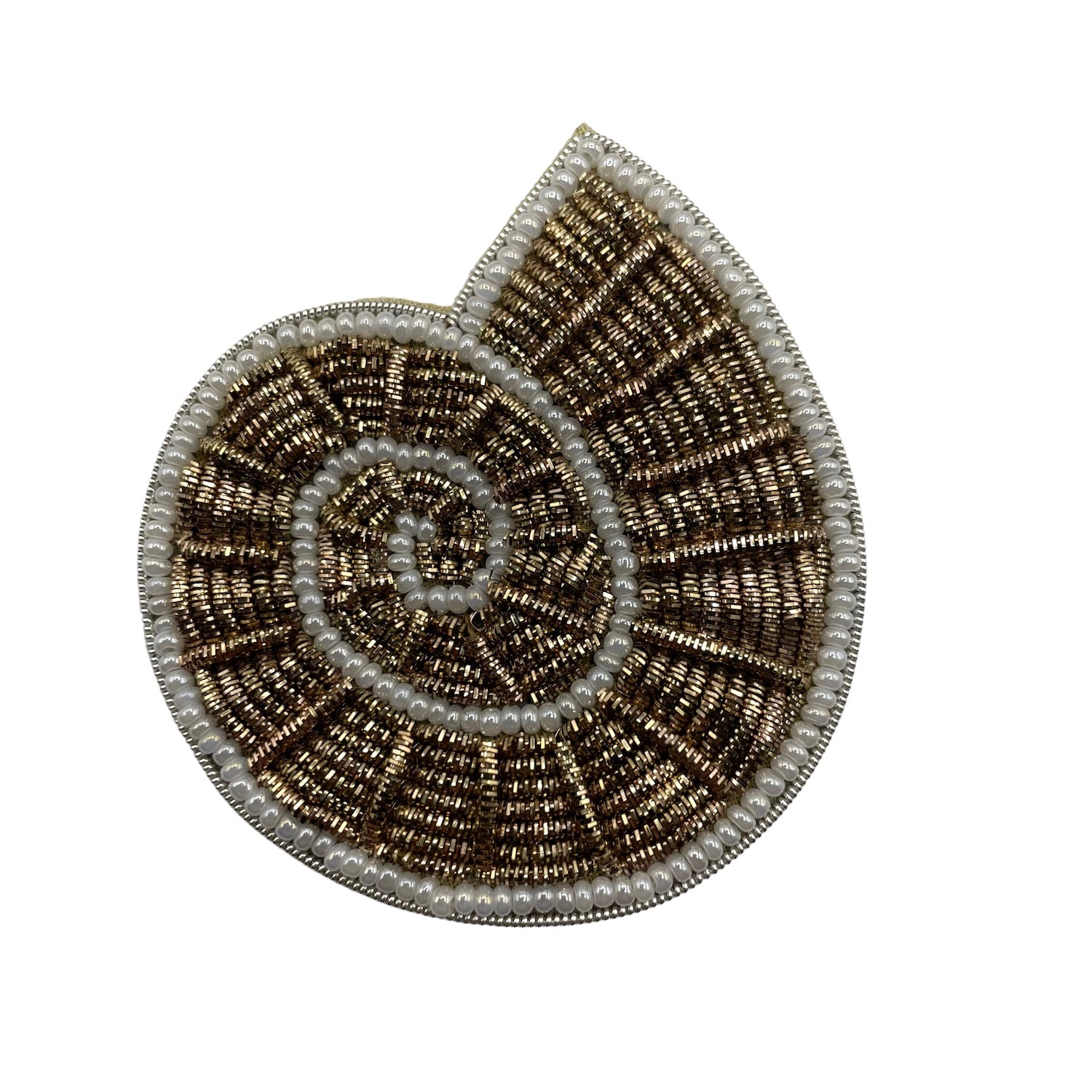 A beautiful shell shaped brooch. Hand embroidered with gold thread. This beautiful brooch measures 5.5 cm wide and 5cm high.