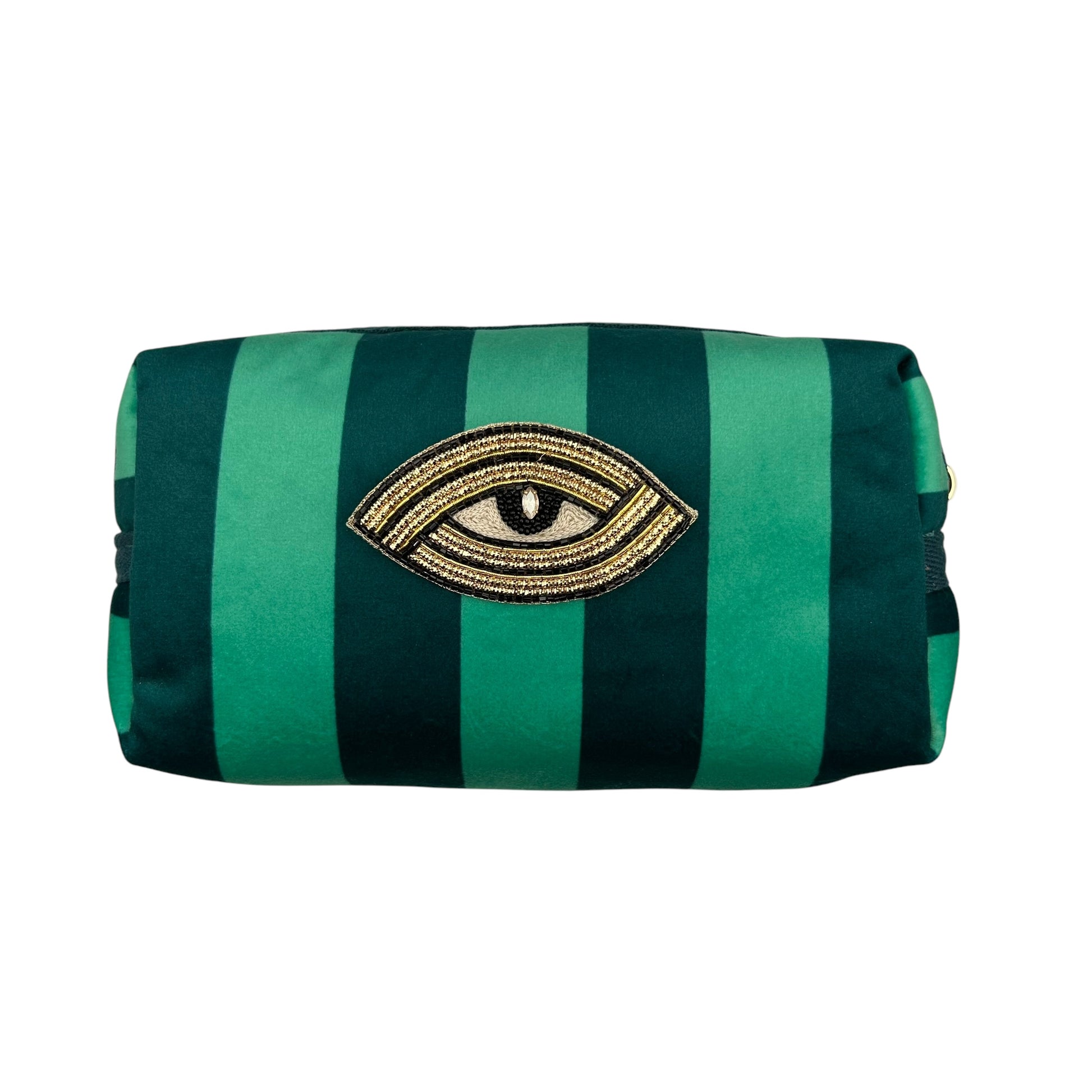 A gorgeous teal stripe velvet makeup bag, with a detachable Linear Eye brooch.