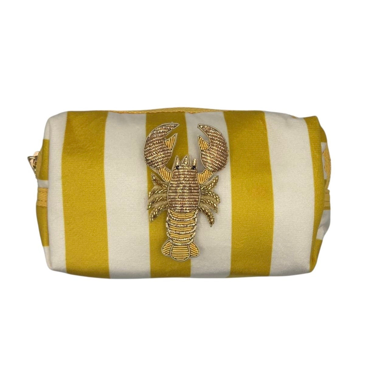 A gorgeous yellow and cream stripe velvet makeup bag, with a detachable Lobster brooch.